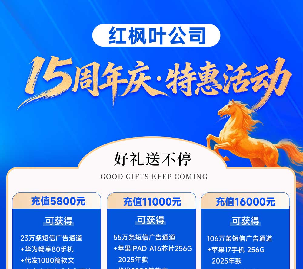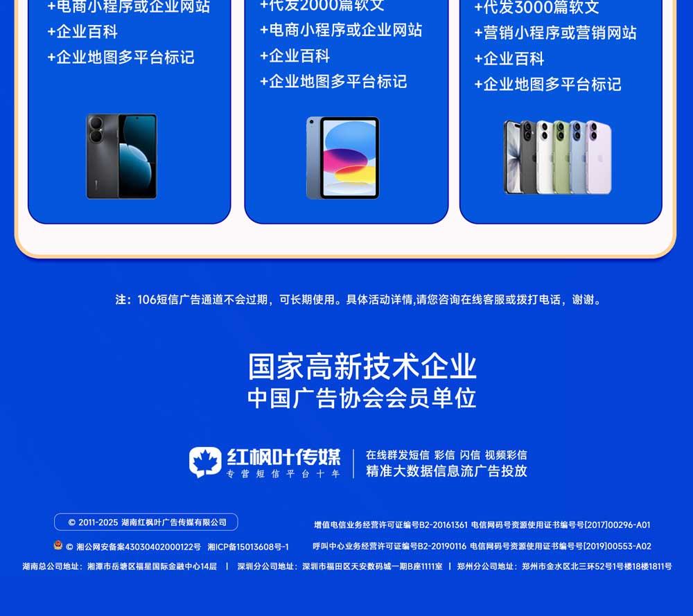 免費(fèi)注冊(cè)紅楓葉短信群發(fā)平臺(tái) 點(diǎn)擊撥打7*24小時(shí)客服熱線 短信群發(fā)app 彩信群發(fā)app 百度愛采購 朋友圈廣告 信息流廣告 媒體軟文代發(fā)布 各大APP下載應(yīng)用市場(chǎng)廣告 紅楓葉官方微博