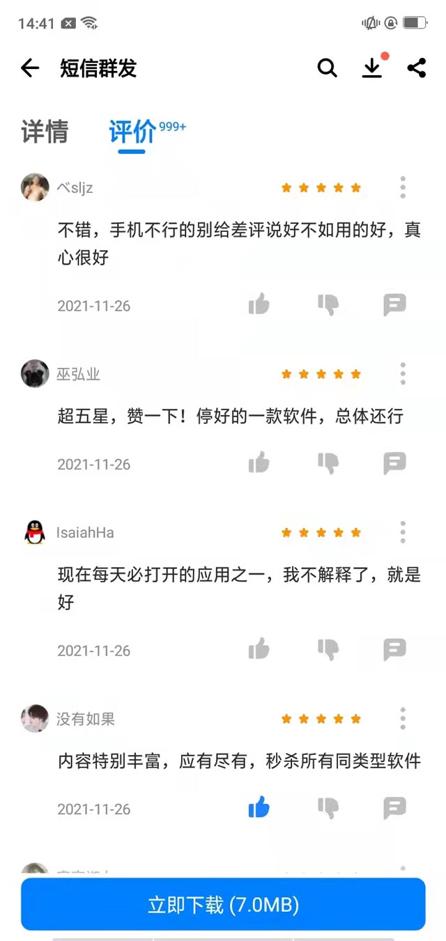 除了簡單的群發(fā)短信,這款A(yù)PP還有分組、簽名前置、定時發(fā)送、再發(fā)一條等功能,可以滿足各種短信群發(fā)場景,而且APP在安卓和蘋果應(yīng)用商店都有下載,紅楓葉傳媒是獲工信部頒發(fā)SP證的單位,國家高新技術(shù)企業(yè),是官方認(rèn)證的,資質(zhì)齊全,不用擔(dān)心安quan問題哈。